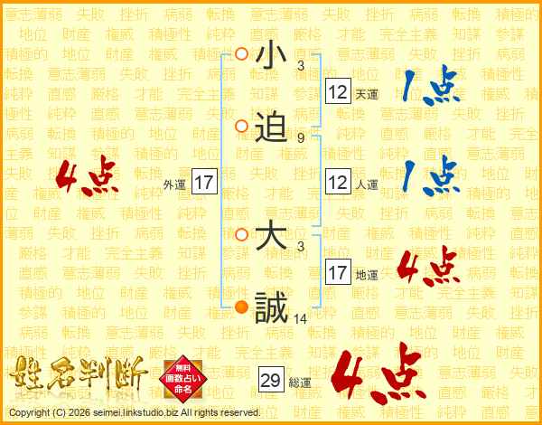 生活面を象徴する運勢です。外部から受ける影響力を表し、結婚運、家庭運や職場、環境への順応性を表します。総運から人運を引いた画数。姓や名が1文字の場合を除く。