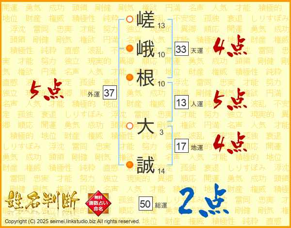 嵯(13画)峨(10画)根(10画) 大(3画)誠(14画)