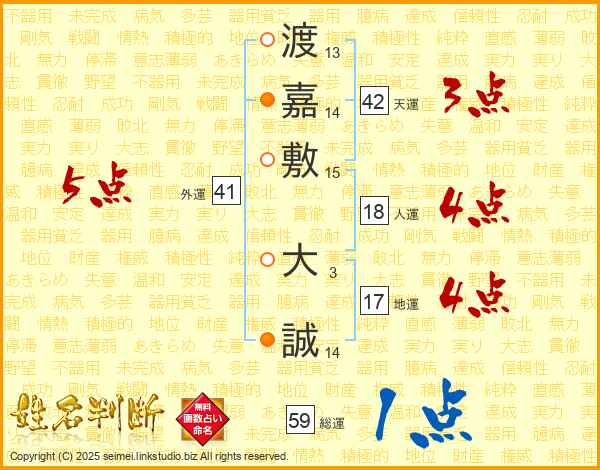 渡(13画)嘉(14画)敷(15画) 大(3画)誠(14画)