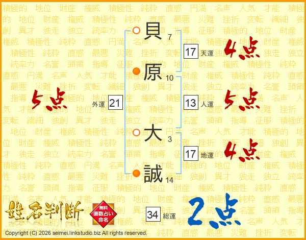 貝(7画)原(10画) 大(3画)誠(14画)