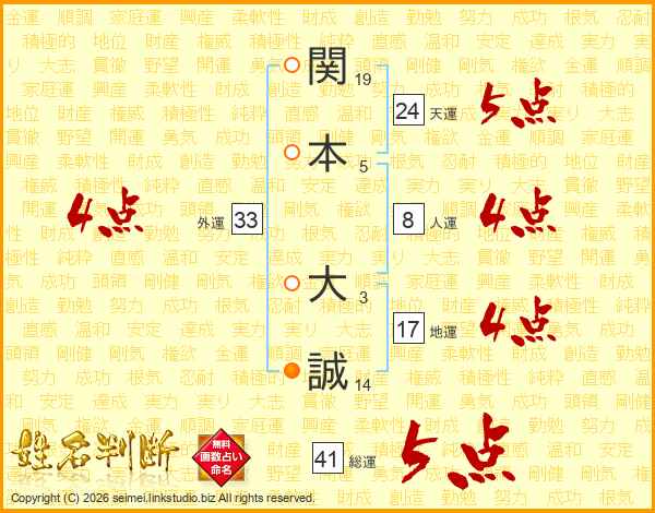 生活面を象徴する運勢です。外部から受ける影響力を表し、結婚運、家庭運や職場、環境への順応性を表します。総運から人運を引いた画数。姓や名が1文字の場合を除く。