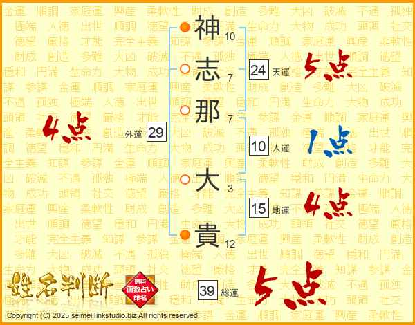 神(10画)志(7画)那(7画) 大(3画)貴(12画)