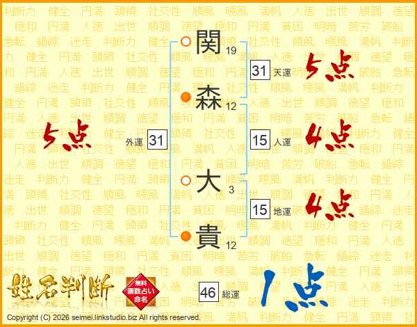 関(19画)森(12画) 大(3画)貴(12画)