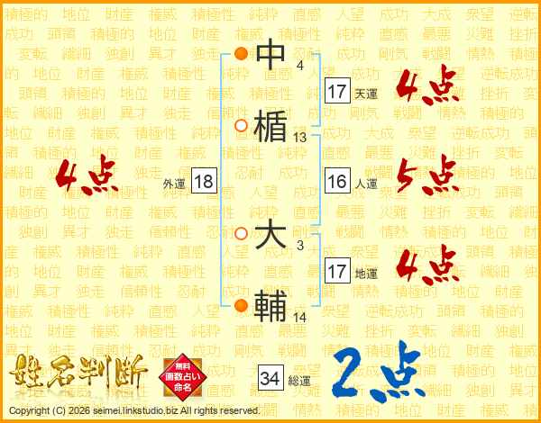生活面を象徴する運勢です。外部から受ける影響力を表し、結婚運、家庭運や職場、環境への順応性を表します。総運から人運を引いた画数。姓や名が1文字の場合を除く。