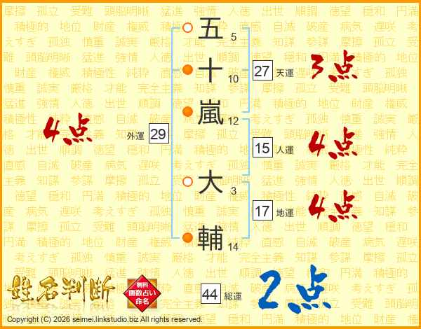 五(5画)十(10画)嵐(12画) 大(3画)輔(14画)