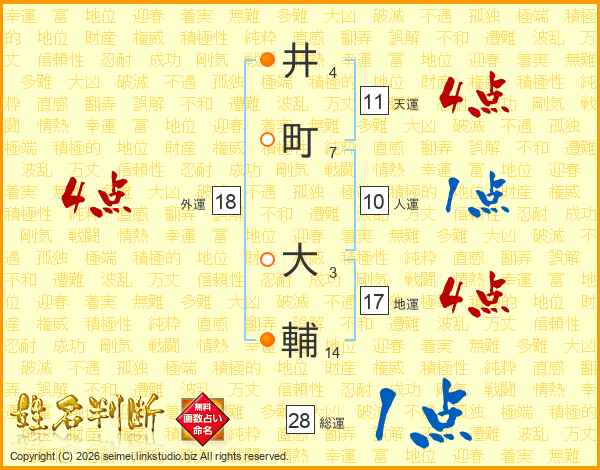 生活面を象徴する運勢です。外部から受ける影響力を表し、結婚運、家庭運や職場、環境への順応性を表します。総運から人運を引いた画数。姓や名が1文字の場合を除く。