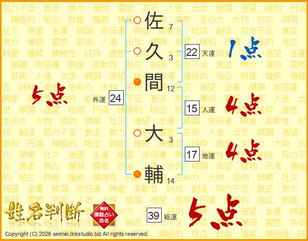 佐(7画)久(3画)間(12画) 大(3画)輔(14画)