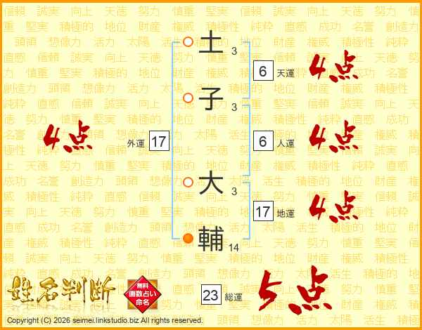 生活面を象徴する運勢です。外部から受ける影響力を表し、結婚運、家庭運や職場、環境への順応性を表します。総運から人運を引いた画数。姓や名が1文字の場合を除く。