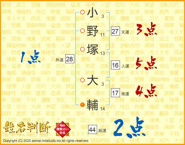 小(3画)野(11画)塚(13画) 大(3画)輔(14画)