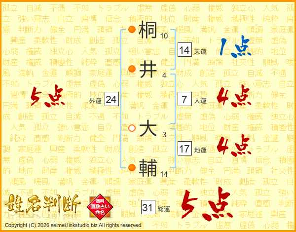 あなたの人生を表す1番重要な運勢です。生涯を通じて影響する総合運となり、主に50歳以降の晩年期に影響を及ぼします。苗字と名前の合計画数。