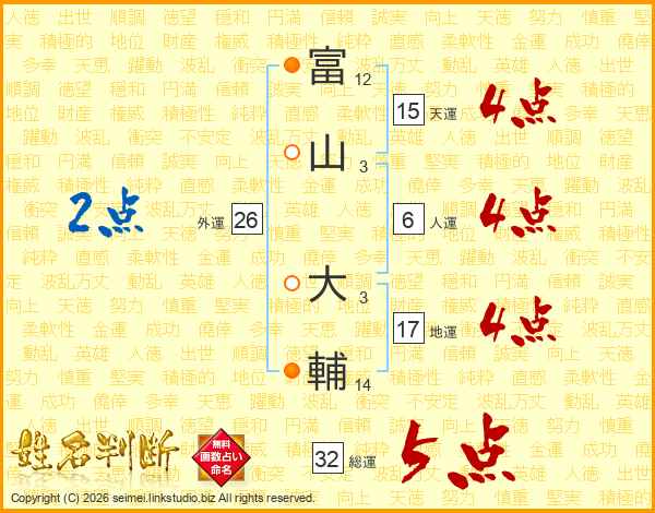 富(12画)山(3画) 大(3画)輔(14画)