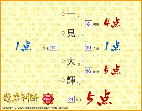 生活面を象徴する運勢です。外部から受ける影響力を表し、結婚運、家庭運や職場、環境への順応性を表します。総運から人運を引いた画数。姓や名が1文字の場合を除く。