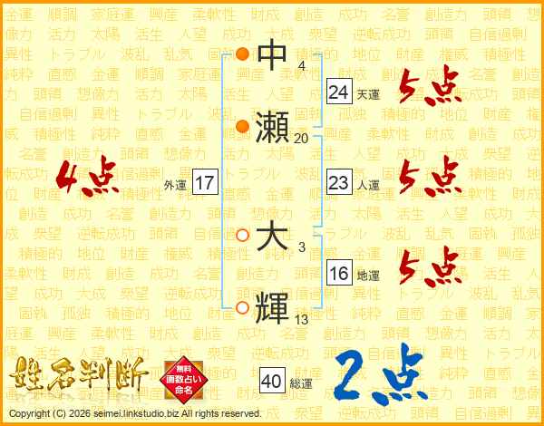 中(4画)瀬(20画) 大(3画)輝(13画)