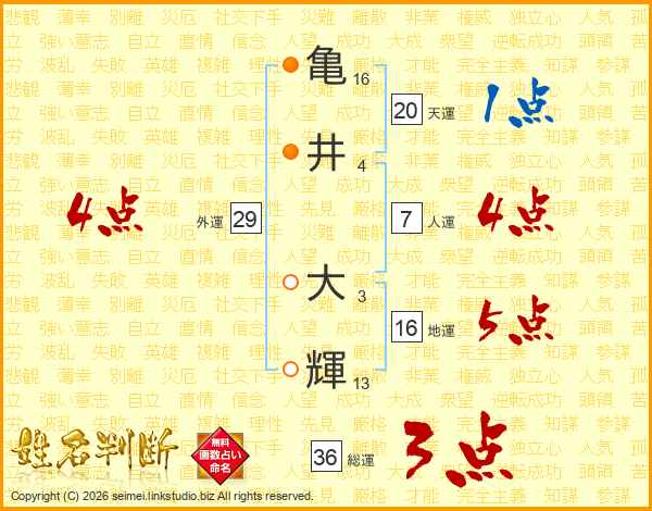 亀(16画)井(4画)  大(3画)輝(13画)