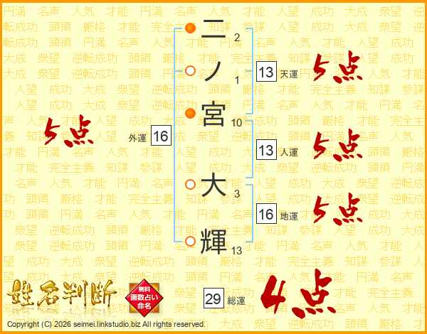 二(2画)ノ(1画)宮(10画) 大(3画)輝(13画)