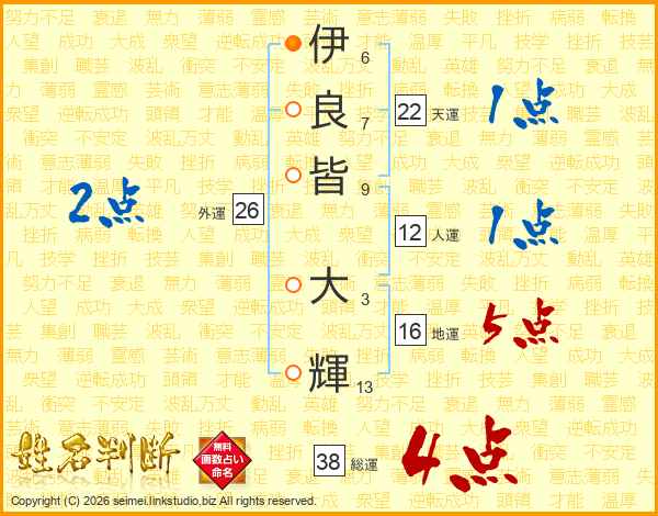 伊(6画)良(7画)皆(9画) 大(3画)輝(13画)