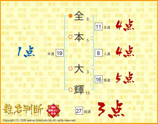 全(6画)本(5画) 大(3画)輝(13画)