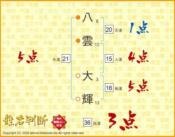 生活面を象徴する運勢です。外部から受ける影響力を表し、結婚運、家庭運や職場、環境への順応性を表します。総運から人運を引いた画数。姓や名が1文字の場合を除く。