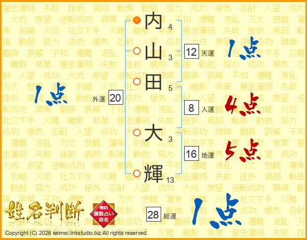 内(4画)山(3画)田(5画) 大(3画)輝(13画)