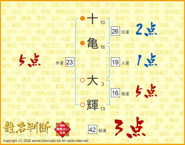 十(10画)亀(16画) 大(3画)輝(13画)