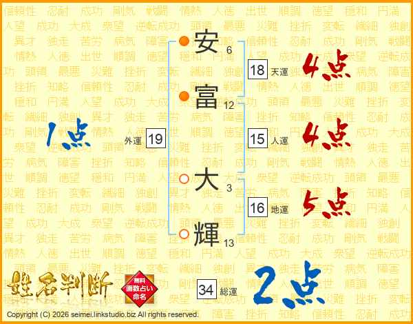 安(6画)富(12画) 大(3画)輝(13画)