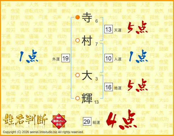 寺(6画)村(7画) 大(3画)輝(13画)