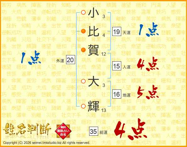 小(3画)比(4画)賀(12画) 大(3画)輝(13画)