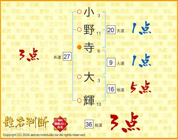 小(3画)野(11画)寺(6画) 大(3画)輝(13画)