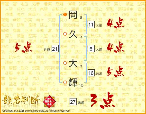 岡(8画)久(3画) 大(3画)輝(13画)