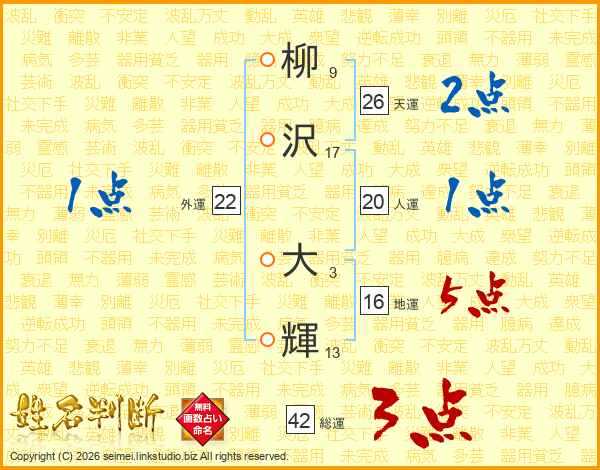 柳(9画)沢(17画) 大(3画)輝(13画)