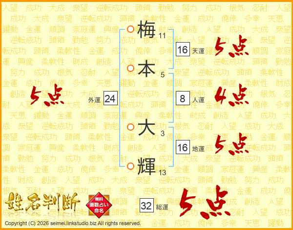 あなたの人生を表す1番重要な運勢です。生涯を通じて影響する総合運となり、主に50歳以降の晩年期に影響を及ぼします。苗字と名前の合計画数。