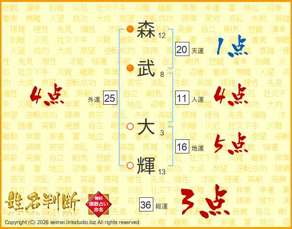 あなたの人生を表す1番重要な運勢です。生涯を通じて影響する総合運となり、主に50歳以降の晩年期に影響を及ぼします。苗字と名前の合計画数。