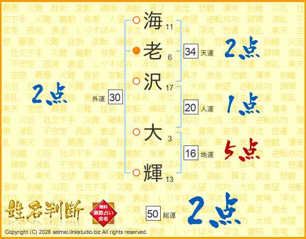 海(11画)老(6画)沢(17画) 大(3画)輝(13画)
