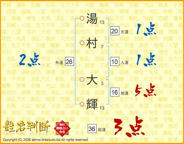 湯(13画)村(7画) 大(3画)輝(13画)