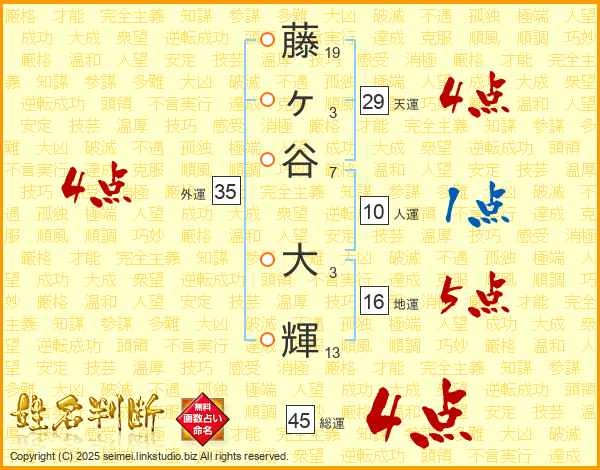 藤(19画)ヶ(3画)谷(7画) 大(3画)輝(13画)