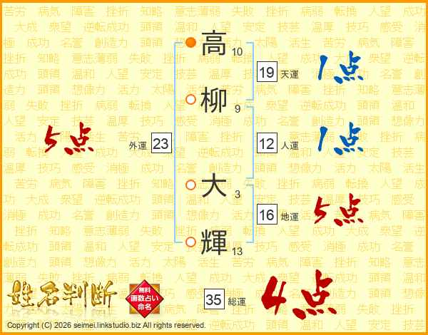 高(10画)柳(9画) 大(3画)輝(13画)