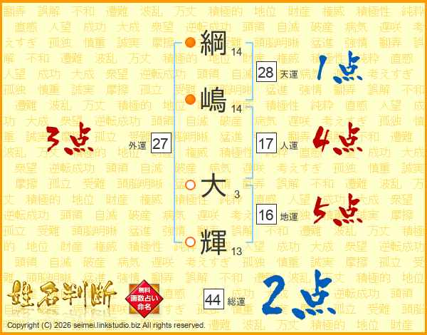 綱(14画)嶋(14画) 大(3画)輝(13画)