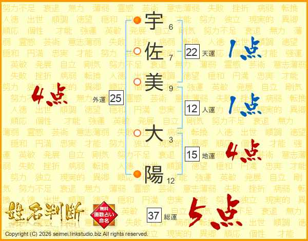 宇(6画)佐(7画)美(9画) 大(3画)陽(12画)