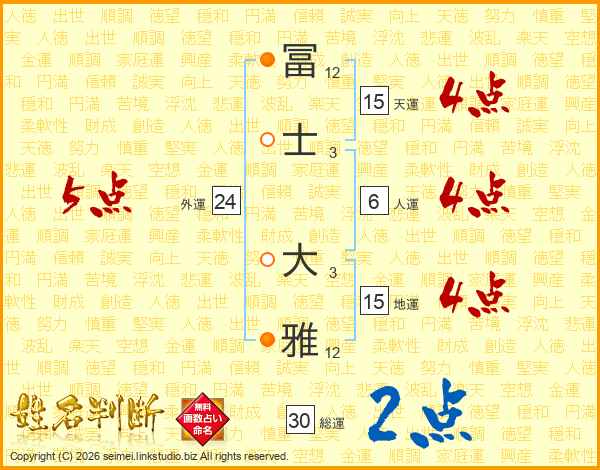 あなたの人生を表す1番重要な運勢です。生涯を通じて影響する総合運となり、主に50歳以降の晩年期に影響を及ぼします。苗字と名前の合計画数。