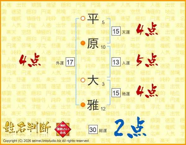 あなたの人生を表す1番重要な運勢です。生涯を通じて影響する総合運となり、主に50歳以降の晩年期に影響を及ぼします。苗字と名前の合計画数。