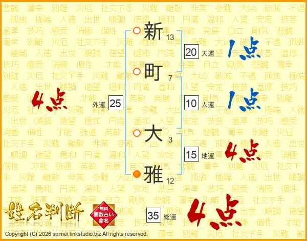 画数の奇数(○陽)と偶数(●陰)の配列で吉凶を占います。どちらかにかたよる名前は大凶名で避ける必要があります。画数の奇数偶数。