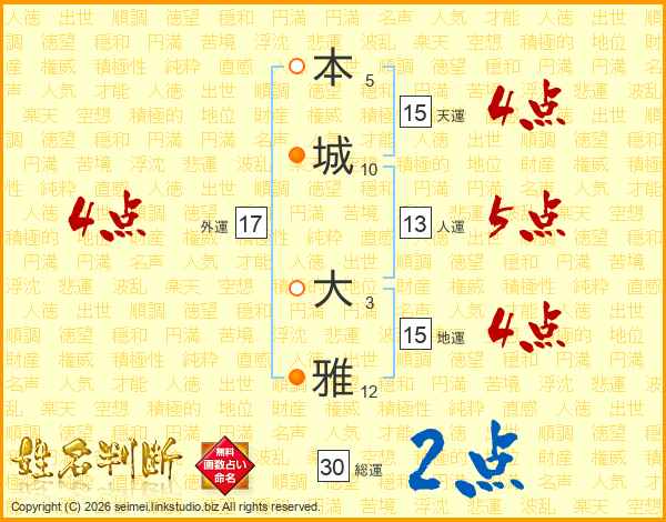 あなたの人生を表す1番重要な運勢です。生涯を通じて影響する総合運となり、主に50歳以降の晩年期に影響を及ぼします。苗字と名前の合計画数。