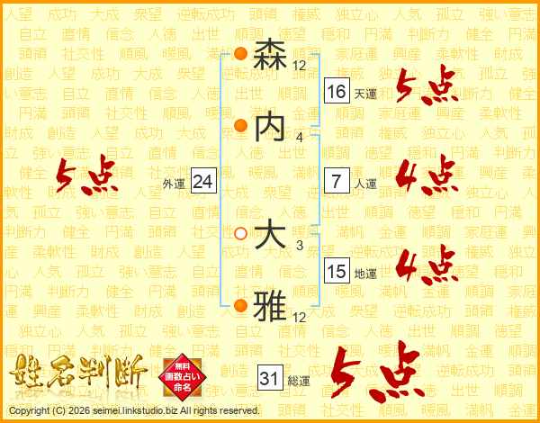 森(12画)内(4画) 大(3画)雅(12画)