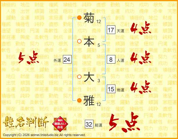 菊(12画)本(5画) 大(3画)雅(12画)