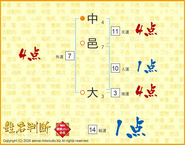 生活面を象徴する運勢です。外部から受ける影響力を表し、結婚運、家庭運や職場、環境への順応性を表します。総運から人運を引いた画数。姓や名が1文字の場合を除く。