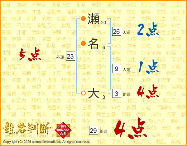 瀬名大さんの総運は29画の4点!