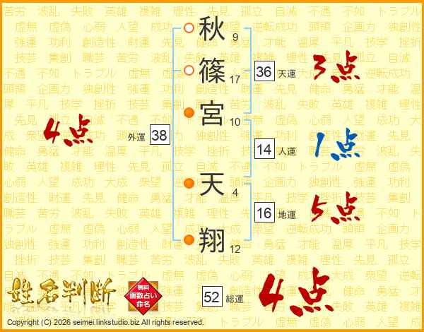 秋(9画)篠(17画)宮(10画) 天(4画)翔(12画)