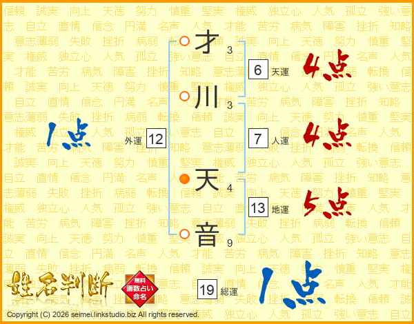 生活面を象徴する運勢です。外部から受ける影響力を表し、結婚運、家庭運や職場、環境への順応性を表します。総運から人運を引いた画数。姓や名が1文字の場合を除く。
