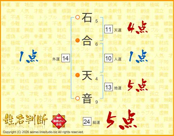 生活面を象徴する運勢です。外部から受ける影響力を表し、結婚運、家庭運や職場、環境への順応性を表します。総運から人運を引いた画数。姓や名が1文字の場合を除く。