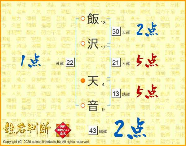 飯(13画)沢(17画) 天(4画)音(9画)